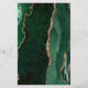 The left-hand edge of this elegant modern wedding menu features an emerald green watercolor agate border trimmed with faux gold glitter. The customisable text combines whimsical gold-coloured handwriting script and copperplate fonts on a slate black background. The reverse side features a matching emerald green and gold agate design.