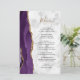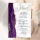 The left-hand edge of this elegant modern wedding menu features a purple watercolor agate border trimmed with faux gold glitter. The customisable text combines black and gold-coloured handwriting script and copperplate fonts on a grey and white marble background. The reverse side features a matching purple and gold agate design.