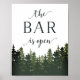 Invite guests to grab their favourite libation with our charming rustic wedding bar sign. 11x14 bar sign features a bottom border of evergreen pine trees in rich shades of hunter green, with "the bar is open" in off-black lettering.