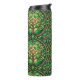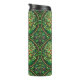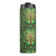 Tall stainless steel travel mug with intricate green and brown leafy mandala pattern, viewed from two angles. Elegant and earthy design.