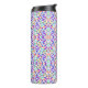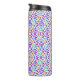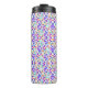 Tall travel mug with a colorful, intricate paisley pattern in purple, pink, green, and yellow. The black lid contrasts with the vibrant design, conveying a playful, lively tone.