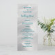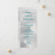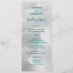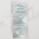 Wedding menu template for a beach themed reception. White sand background image with tropical blue text. Menu title is in handwritten script font and the rest is printed text. First names of the bride and groom are at the top and the menu selections are listed in a paragraph to easily customise for your event. Choose any paper style, or use the instant download option.