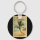 A uniquely retro mid-century modern Tampa Florida art print in vintage travel poster style. It features a curved palm tree on sandy beach with ocean under a blue cloudy sky.
