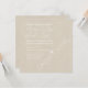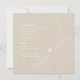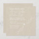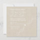 A simple minimalist wedding invitation on a tan flecked background with white text.