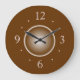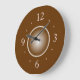 A tan brown clock with a white glow effect centre.This simplistic design has large numerals to match.Available in round and square shapes. Perfect for your kitchen, or dining area or for a special occasion gift .