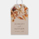 Tan Fall Leaves Wedding Favour Tags. Add a heartfelt finishing touch to your wedding favours with this rectangular favour tag, designed with warm autumn elegance in mind. Featuring hand-painted watercolor leaves in burnt orange and terracotta alongside cream and beige dahlias and copper-toned roses, all set against a taupe background, this tag brings seasonal charm to even the smallest detail. Tie it to treat bags, boxes, or gifts to leave a lasting impression. Elevate your favours—customise your tag today.