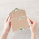 All in one wedding invitation featuring botanical greenery, rustic leaves, and elegant typography on a tan background. The invitation includes a perforated RSVP card featuring a QR code. Designed by Thisisnotme©