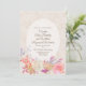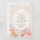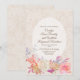 Elegant wedding invitation done in a tan and ivory faux textured, flourish damask background. A white semi transparent oval text area is decorated with colourful iridescent flowers, along the bottom. Personalise all the text for your special day. Matching products are available.