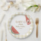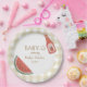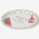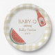 Tan gingham circular baby-q themed baby shower plate for gender neutral event.