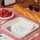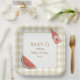 Tan gingham paper plate for gender neutral baby-q themed baby shower.