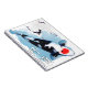 Black and white koi with red spot on the head. Known as a Tancho koi in japanese. With cranes, and japanese letters for "tancho".