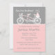 Fun wedding design featuring a flower covered tandem bicycle. A three tier wedding cake is on the back bumper and two love birds with hearts complete the theme. Customise gifts and stationery with your own personalised text. On T-shirts, tote bags, wedding shower invitations, save the date announcements, postage, wedding planners, keepsakes and more! PinkInkArt original!