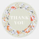 Elegant and chic wedding sticker with beautiful tangerine wreath and text "Thank You". Floral botanical illustration with spring delicate flowers, blooming branches and citrus. Pastel grey green and orange colours.