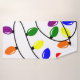 This towel set has a red washcloth, a green hand towel, and a bath towel with a Christmas design of tangled lights in red, blue, yellow, green, pink, and purple.