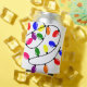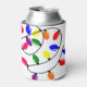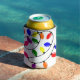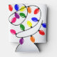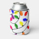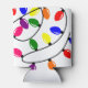 This can cooler has a Christmas design of tangled lights in red, blue, yellow, green, pink, and purple.