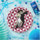 Retro-style elegant tango dancers design. The background to the stylised dancers is a burgundy / maroon and white geometric pattern.