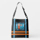 It's very roomy. The fabric is soft and flexible, and the strap is wide and adjustable to fit across the body. The printing is true to the photo.