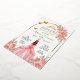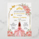 Esta tarjeta para fiesta de quinceanera tiene rosas rosas con color dorado y la imagen de una quinceanera con un bestido de princesa color rosa con dorado. Se puede personalizar con su nombre, el nombre de los padres, padrinos, la fecha y direccion de la fiesta.