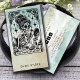 A unique tarot style makeup artist business card featuring a skeleton with tools of the nail technician. A unique style with a touch of humour. Ombre watercolor wash.