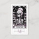 A unique nail technician business card featuring a skeleton with tools of the nail technician. A unique style with a touch of humour. Pink & black.