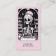A unique nail technician business card featuring a skeleton with tools of the nail technician. A unique style with a touch of humour. Pink & black.