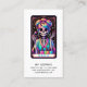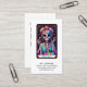 An edgy editable nail artist Tarot themed skeleton business card template design, with QR code, social media handles and vintage typography in pink and white. Scannable QR Code instantly directs clients to your booking page.