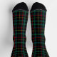 Socks with dark tartan pattern in black, green and red with yellow and blue crisscrossing.