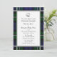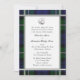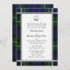 Traditional Scottish tartan plaid wedding invitation, done with the lovely blue and green tartan of the Forbes clan. A silver tone framed white text area, in the middle, has a spiral Koru symbol, at the top. Text is in black and is fully customisable to suit your wedding needs. Personalise text to suit your needs.