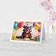 The front of this birthday card features a lively and energetic design with a cartoon-like character—a cute and mischievous animal resembling a Tasmanian devil. The character is wearing a striped party hat and has a wide, joyful grin, giving off a playful and fun vibe. In front of the character is a small birthday cake topped with candles, ready to be celebrated. Surrounding the scene are brightly coloured balloons in hues of yellow, purple, blue, and red, creating a festive atmosphere.