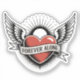 A classic, bold, and stylized tattoo-style graphic conveying themes of solitude and heartbreak. The central element is a bright red, glossy heart with a white highlight, flanked by large, detailed wings. A ribbon or banner scrolls across the heart, bearing the emotional text: "FOREVER ALONE" in block letters. Surrounding sunburst or ray motif in black, creating a dramatic, retro aesthetic typical of old-school American traditional tattooing.