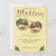 This custom wedding invite features tattoo style graphics and lettering with freehand style gothic lettering spelling out the word wedding and retro style hearts in red with blue flower accents that are ready to be personalised with the name of the bride and groom. The graphics and text are set against a faux vintage paper background for a vintage look. This design is also available with a plain white background.