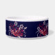 This design is a tattoo of many different flowers, leaves, and vines. A few butterflies can be seen flying around the flowers. The colours of the tattoo are a red colour with a hint of peach. There are 4 designs on the dish going around the sides of the dish. This dog dish can be customised with your pets name on the front of the dish.