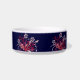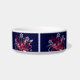 This design is a tattoo of many different flowers, leaves, and vines. A few butterflies can be seen flying around the flowers. The colours of the tattoo are a red colour with a hint of peach. The pet bowl has 4 flowers, 2 on each side. Your pets name can be put on the front of this dish. A dark blue backround was used.