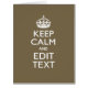 Your personalised Keep Calm saying on a fine custom taupe beige colour style decor. A personalised Keep Calm style saying on a one of a kind gift. Humourous or whimsical try on your creative words on two editable lines of text. Remember to use CAPITAL letters for best results.