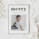 Celebrate the holidays with this stylish photo postcard featuring bold taupe green "merry" lettering in a retro font. Designed with vintage holiday vibes in mind, this midcentury-inspired postcard lets your photo shine while adding a festive pop of colour. It’s a festive choice for holiday greetings, family updates, or winter celebrations. The minimalist layout complements all photo styles, from family portraits to cosy snapshots. A great way to stand out in the holiday mail pile.