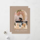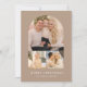 Modern holiday photo card featuring 3 of your photos arranged in an arch-shaped grid layout. Personalise the front of the multi-photo holiday card with your custom greeting and family name displayed in white lettering with a warm taupe background. The card reverses to a subtle beige and white dot pattern.