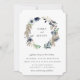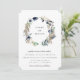 Beautiful watercolor wreath of taupe, navy blue and green foliage and flowers, wedding invitation. Back of card features solid navy blue colour.