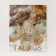 Taurus the bull hand drawn in black and featuring brown blue and gold planets on an airy watercolor background with gold leaves and flowers. Unique game puzzle gift for an astrology lover or someone celebrating a birthday under the Earth sign of Taurus - April 20 to May 20.