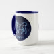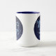 Mug featuring the zodiac symbol for Taurus in soft silver blue, as a round medallion, overlaid with the stars of the constellation, against a starry sky background graded from deep midnight blue to black.