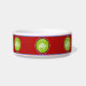 This is a heavy, durable bowl decorated with Tibbies of many colors, the perfect size for hungry/thirsty Tibs. The design is interesting and printing clear.