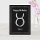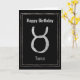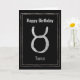Send a personalised Happy Birthday greeting card to your favourite Taurus with this stylised hammered silver Taurus the Bull astrology zodiac star sign in a silver double line frame on a black background. The Happy Birthday and Zodiac sign text on the front of the card can be personalised if you have another greeting in mind. Inside the card you can add the name of the Birthday girl or boy above the text that says: You are going to have a terrific birthday, it's written in the stars. A fun personalised card for someone born under the star sign of Taurus.