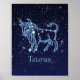 Print featuring the symbol for Taurus in soft silver blue, overlaid with the stars of the constellation, against a starry sky background graded from deep midnight blue to black.