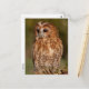 Animal card showing tawny owl sitting on a branch. The tawny owl or brown owl (Strix aluco) is a stocky, medium-sized owl commonly found in woodlands across much of Eurasia. Its underparts are pale with dark streaks, and the upperparts are either brown or grey. The nest is typically in a tree hole where it can protect its eggs and young against potential predators. Although many people believe this owl has exceptional night vision, its retina is no more sensitive than a human's. Rather, it is its asymmetrically placed ears that are key to its hunting because they give the tawny owl excellent directional hearing. Its nocturnal habits and eerie, easily imitated call, have led to a mythical association of the tawny owl with bad luck and death.