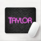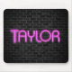 TAYLOR name is in glowing pink marquee neon lights on city brick wall.