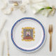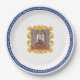 From an original series of classical music collectors plates by ZoeSPEAK, this plate features a portrait of the composer Peter (Pyotr) Ilyich Tchaikovsky. The portrait is a hand tinted etching, surrounded by original illustrations: an ornate golden frame with a Russian onion dome on top. The frame is on a wallpaper background of medium blue with red and gold stripes, golden suns and white swans. Under the portrait, in red, is the composer's name. The wallpaper is surrounded by more gold ribbons, in the centre of the plate against a white background. There is a medium blue band with white swans and a red border around the edge of the plate.