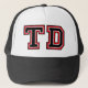"TD" monogram hat with red and black letters