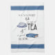 "All you need is a cup of TEA and a good BOOK" words appear with a watercolor painting of a tea cup and a book in blue and white and blue stripes to make this cozy reading themed kitchen towel.