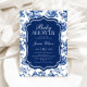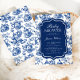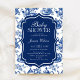 Tea party baby shower blue chinoiserie invitation. Beautiful elegant design in navy blue and white with hand painted botanical accents and teapots. You can choose printed invitations and/or instant download digital template. Perfect for a stylish high tea baby shower.