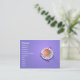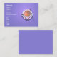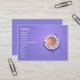 Business card with a charming image of a cup, saucer and spoon with little red flowers on a purple background.