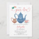 Rustic tea party theme girl's birthday party invitation card featuring illustration of a tea set with a bottle of honey and macarons. The text says "Let's par-tea."